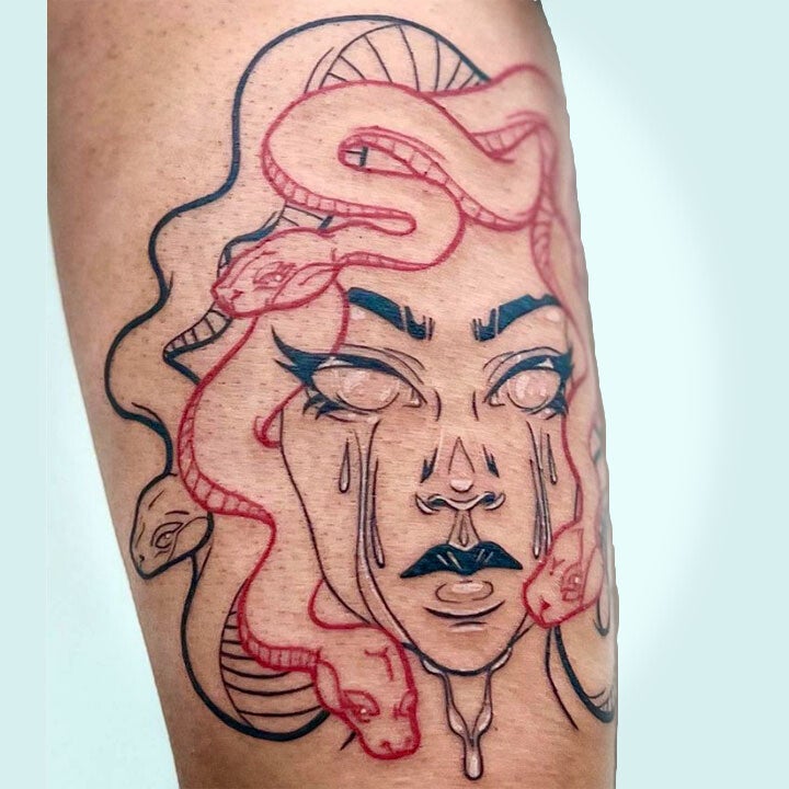 Chorizo is a walking explosion of color—like a confetti cannon filled with wildflowers. Her work and her personality are both rainbows in bloom: bright, bold, cheerful, and just the right amount of loud. If you want a tattoo that radiates joy and turns heads, Chorizo’s your person.